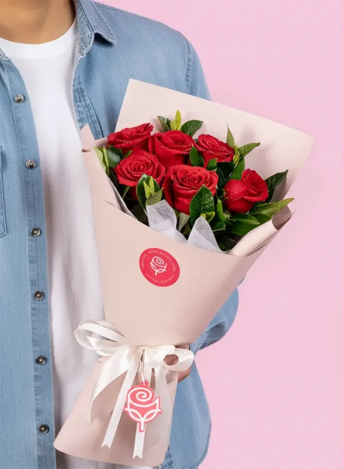 Un regalo clásico que nunca falla: ramo de 6 rosas rojas frescas, símbolo eterno de amor y pasión.