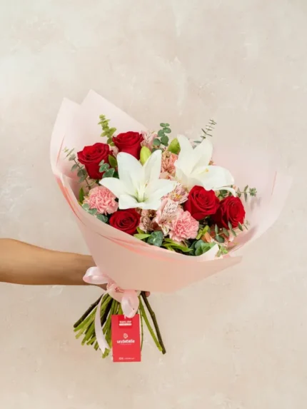 Un detalle elegante y delicado. Este hermoso arreglo floral de lirios blancos premium acompañado de flores rosadas y verdes decorativos es perfecto para transmitir pureza, amor y gratitud. Presentado en una caja cilíndrica decorativa, es ideal para sorprender en aniversarios, cumpleaños, nacimientos o para expresar sentimientos sinceros de admiración.