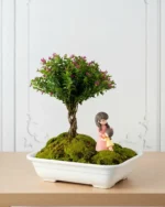 Este hermoso bonsái de felicidad con miniatura decorativa es un detalle lleno de vida y armonía. Presentado en una elegante base blanca, está acompañado de musgo natural y una tierna figura de madre e hija que simboliza el amor y la unión familiar