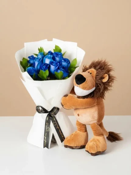Rosas rojas con Peluche de León  Expresa tu amor con un detalle inolvidable 💕: un ramo de rosas rojas acompañado