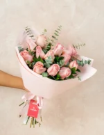¡Delicado ramo de 12 rosas, presentado con follaje fino y envoltura única, ideal para ocasiones especiales!
