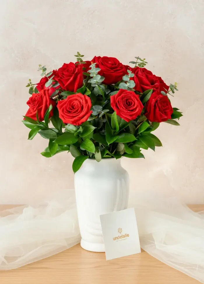 Expresa tu amor con un florero blanco de 12 rosas rojas. Un detalle elegante, romántico y sofisticado, ideal para enamorar y sorprender en cualquier ocasión especial.
