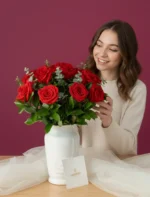 Expresa tu amor con un florero blanco de 12 rosas rojas. Un detalle elegante, romántico y sofisticado, ideal para enamorar y sorprender en cualquier ocasión especial.