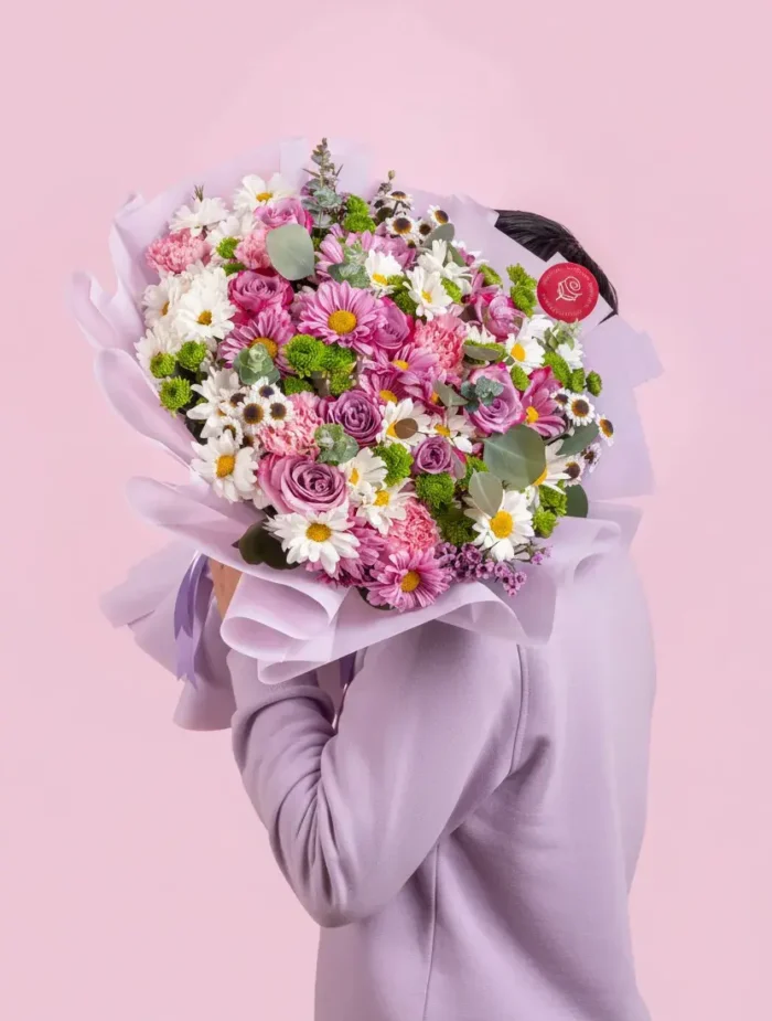 Un ramo buchón lleno de frescura y alegría, con margaritas y flores mixtas en tonos rosados, lilas y blancos.
