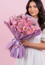Un ramo buchón lleno de frescura y alegría, con margaritas y claveles rosados que transmiten ternura y amor en cada pétalo.