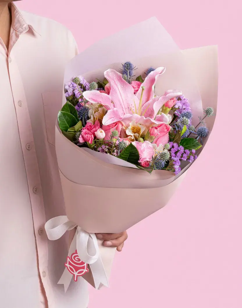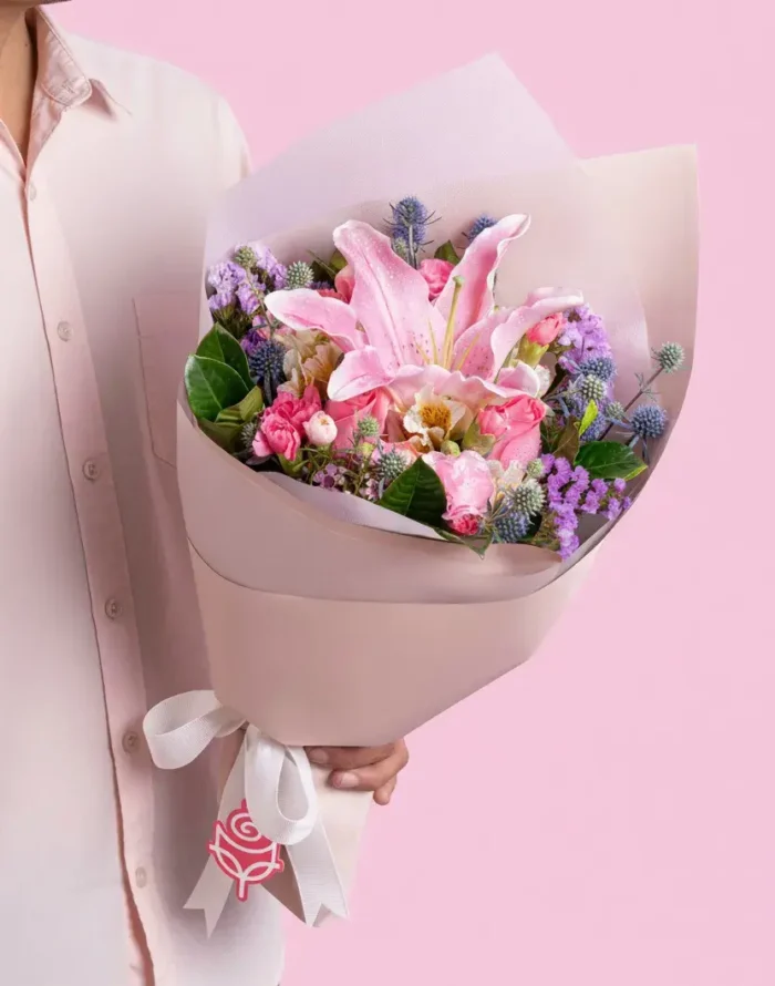 Un detalle romántico y delicado: ramo petit de lilium rosado con flores mixtas frescas en envoltura elegante.