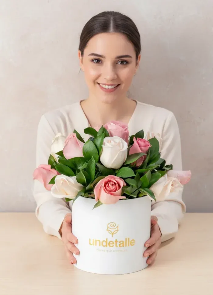 Sorprende con una caja blanca premium con rosas rosadas y blancas. Un detalle lleno de ternura, elegancia y romanticismo, ideal para enamorar o agradecer.